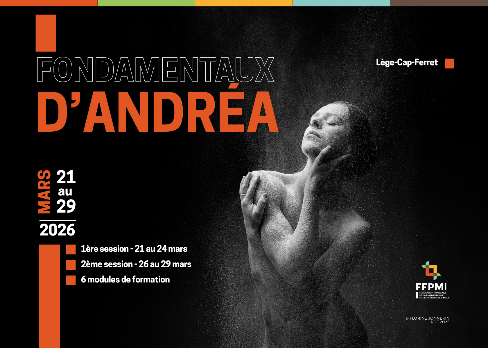 Les fondamentaux d’Andréa s’articulent autour de 6 modules complémentaires, conçus pour revisiter les bases essentielles du métier de photographe. Composition, lumière, post-traitement, gestuelle, direction de modèle, tirage et compréhension du règlement du Portraitiste de France : chaque thématique a été pensée pour renforcer la maîtrise technique et artistique des participants.
